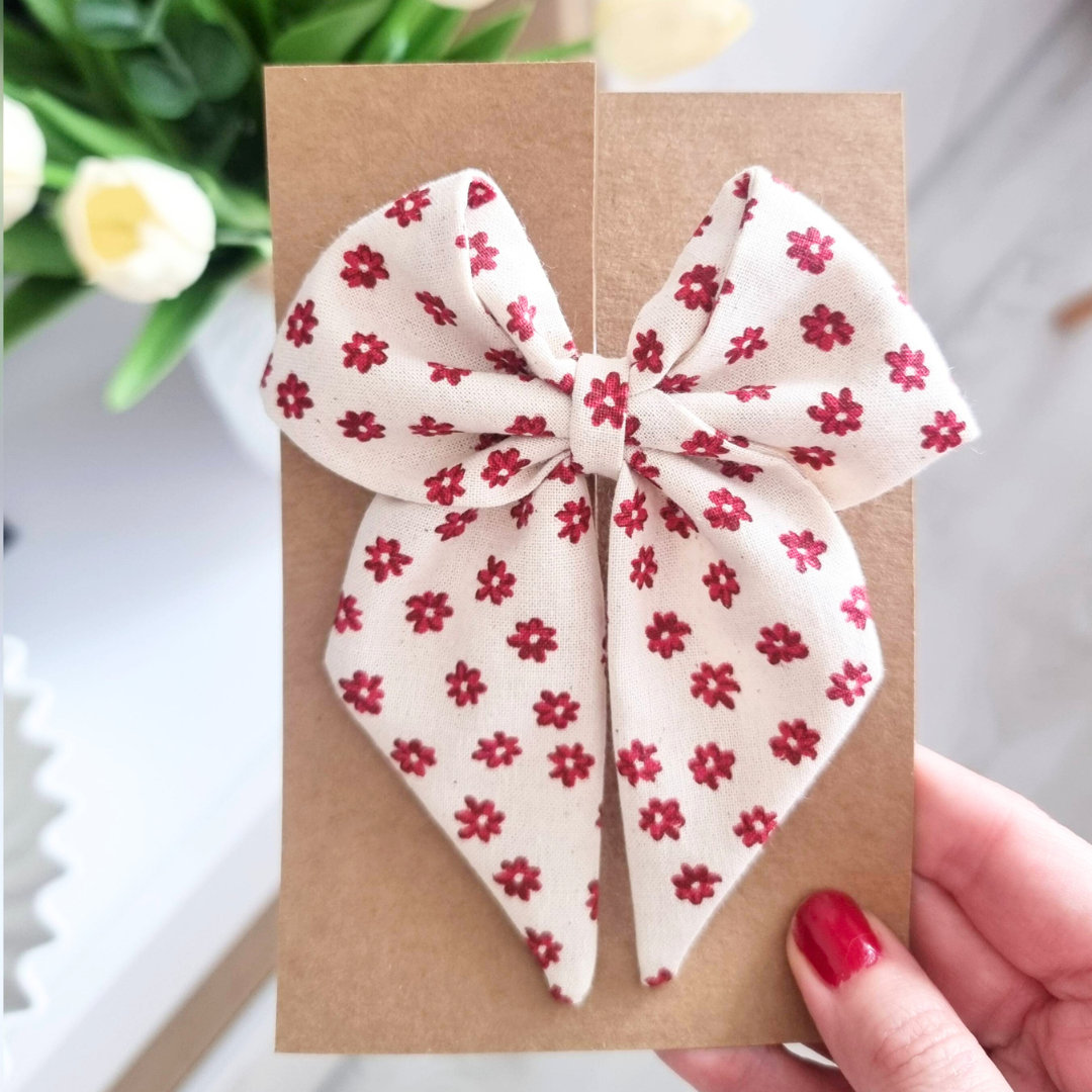 Kokardka Elen – spinka beżowa w bordowe kwiatuszki