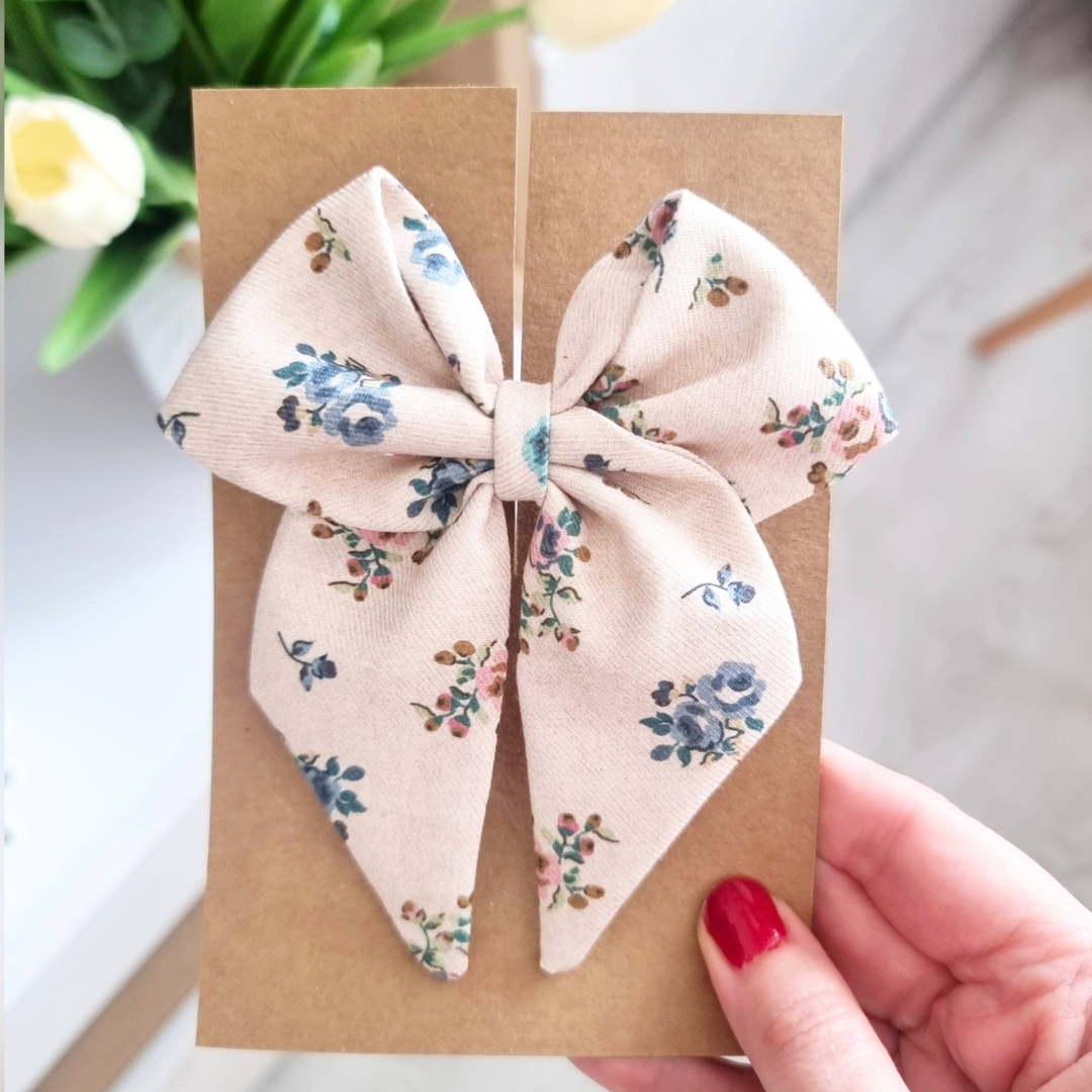Kokardka Elen – spinka beżowa w niebieskie i róż kwiatki