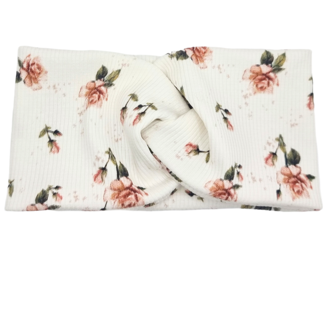 Opaska szeroka przeplatana na głowę ecru w beżowe kwiaty